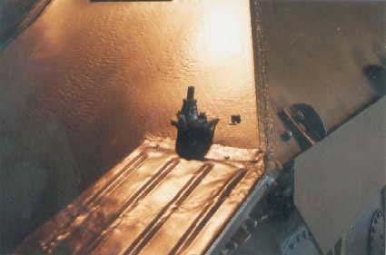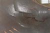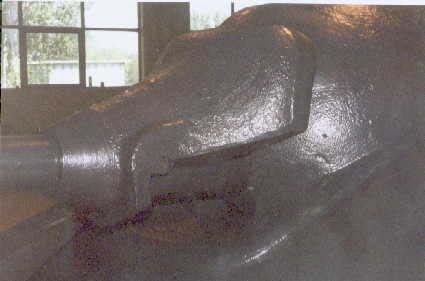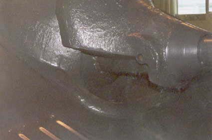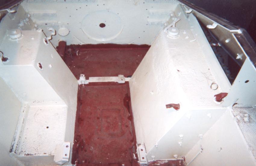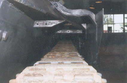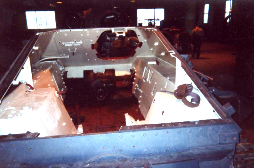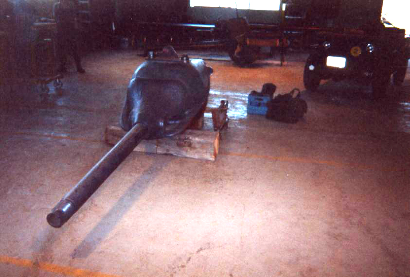 Presently underway at the Canadian Forces Base Borden (Borden, Ontario, Canada), is the restoration of an early production Hetzer which has been on display for years in Worthington Park. A group of volunteers has been given permission, by the Canadian Forces, to restore the vehicle to running condition. One of the volunteers at the Worthington Park Museum, Fred Olsen, has given me permission to use his photos of the vehicle during the restoration process, in order to track the progress and to show images of an original Hetzer that most people would otherwise not get a chance to see. Photos of the same vehicle on display are included elsewhere on my website. The color difference is because of variations in the printing of the photos taken outside and those taken indoors. The paint scheme is not original to the vehicle. The first photo above shows the mount for the Notek blackout driving light at the left front of the vehicle. The second photo shows the bracket where the spare antenna rods were stored on the left side of the hull toward the rear of the vehicle. The next two photos are side views of the early style "Saukopf" gun mantlet. The last photo is a view along the right track, looking forward, and shows the mount used to support the fender.